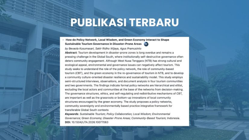 Dosen Departemen Manajemen dan Kebijakan Publik (DMKP) FISIPOL UGM, Bevaola Kusumasari bersama dengan Sakir Ridho Wijaya dan Agus Pramusinto kembali menorehkan capaian akademik melalui publikasi artikel ilmiah yang berjudul “How do Policy Network, Local Wisdom, and Green Economy Interact to Shape Sustainable Tourism Governance in Disaster-Prone Areas?”. Artikel ini telah terbit di jurnal internasional bereputasi International Journal of Tourism Anthropology, sekaligus memperkaya kajian tata kelola pariwisata berkelanjutan di kawasan rawan bencana.