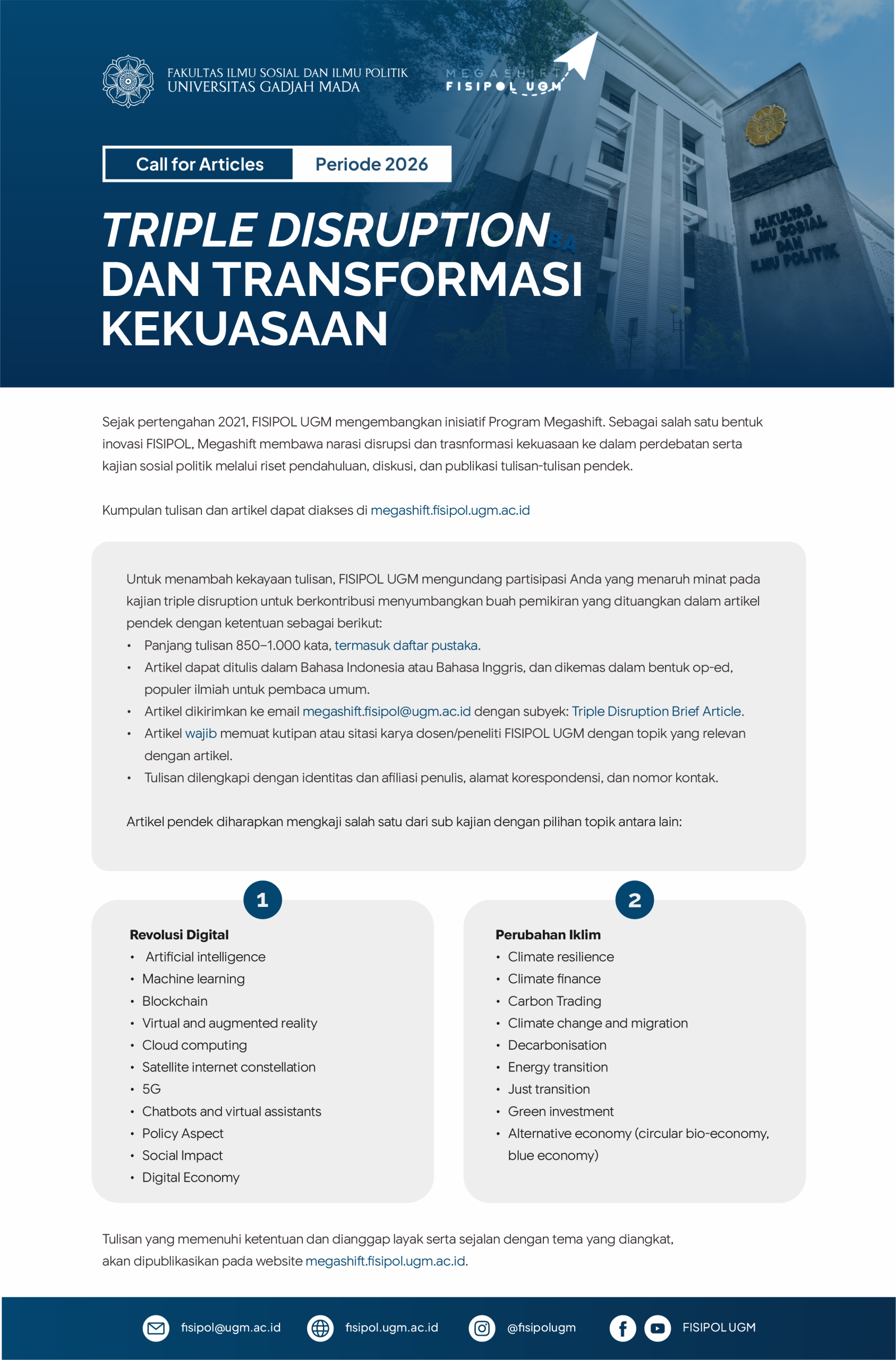 4. Artikel dikirimkan dalam format ms. word ke email megashift.fisipol@ugm.ac.id dengan subyek: Triple Disruption Brief Article