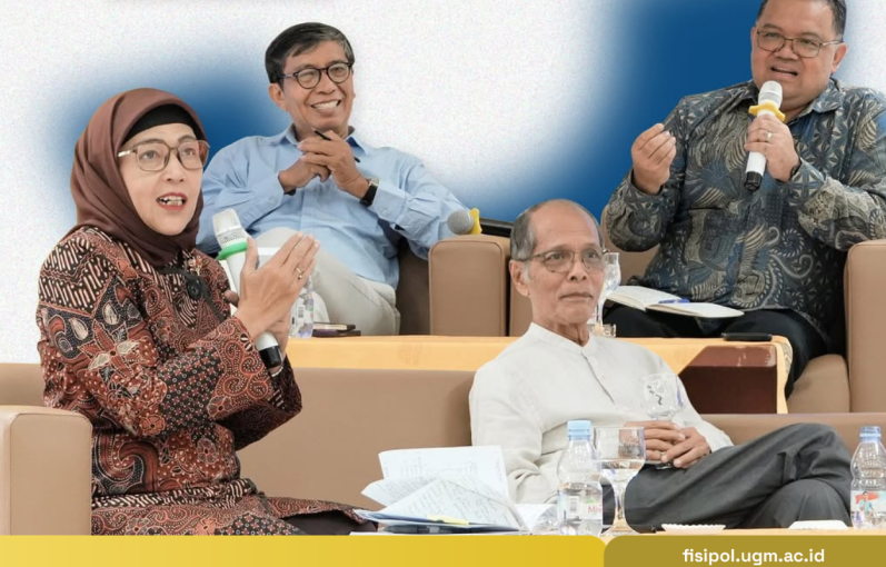 Prof. Mohtar Mas’oed menyoroti konteks global yang anarkis dan menekankan pentingnya memahami dinamika transisi kekuatan. Dalam refleksinya, ia juga mempertanyakan multilateralisme yang saat ini masih dapat diandalkan, sembari mendorong pendekatan minilateralisme guna membahas isu-isu yang lebih spesifik. Prof. Mohtar juga menyinggung potensi ancaman terhadap Indonesia, seperti kedaulatan wilayah, kepentingan ekonomi dan industri strategis, serta tata kelola digital.