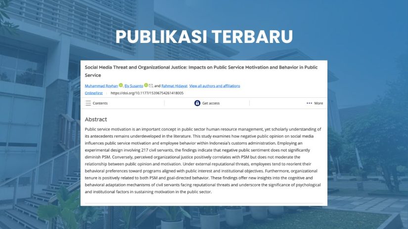 Dosen Departemen Manajemen dan Kebijakan Publik (DMKP) FISIPOL UGM, Ely Susanto kembali merilis publikasi ilmiah terbarunya bersama Muhammad Royhan dan Rahmat Hidayat dengan artikel berjudul “Social Media Threat and Organizational Justice: Impacts on Public Service Motivation and Behavior in Public Service” ini telah terbit di jurnal internasional bereputasi Chinese Public Administration Review, menandai kontribusi penting dalam pengembangan kajian administrasi publik kontemporer.