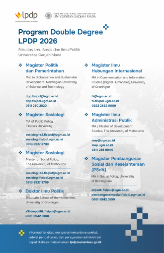 Fakultas Ilmu Sosial dan Ilmu Politik (FISIPOL) Universitas Gadjah Mada membuka Program Double Degree bekerja sama dengan Lembaga Pengelola Dana Pendidikan (LPDP). Program ini memberi kesempatan mahasiswa menempuh pendidikan ganda di FISIPOL UGM dan universitas mitra luar negeri.