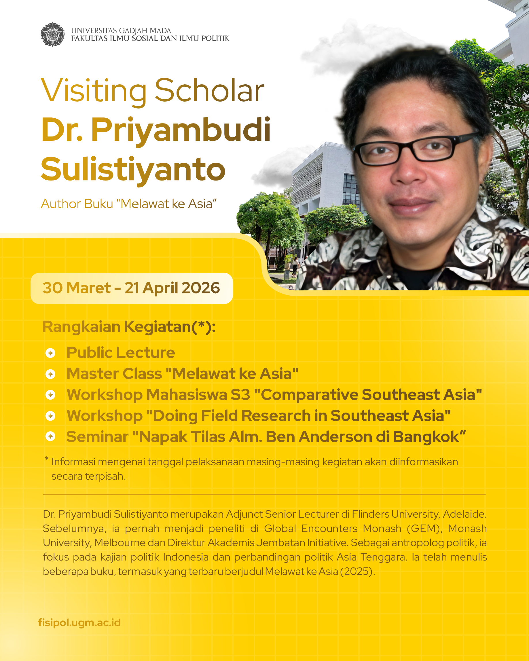 Fakultas Ilmu Sosial dan Ilmu Politik (FISIPOL) Universitas Gadjah Mada (UGM) menerima Visiting Scholar bersama Dr. Priyambudi Sulistiyanto, pada periode 30 Maret hingga 21 April 2026.
